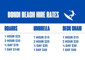 Our mission is to provide top-quality gear, expert advice, and a welcoming community that makes it easy for you to embrace Bondi’s surf culture. Come ride with us and create unforgettable memories! Our mission is also to keep people safe! Please keep in mind, Beach Hire Bondi is condition dependent. As we operate outdoors in nature and on the beach, weather and surf conditions can sometimes affect when we can or cannot provide equipment. For example ,windy conditions are dangerous for umbrellas. Rips, currents and large surf can be dangerous especially for beginners so our friendly team will let you know if it's safe and feel free to call ahead and check!